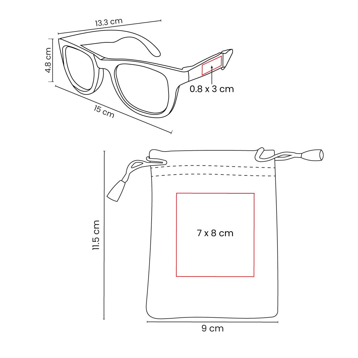 Impresión: Tampografía / Serigrafía, 0.8 x 3 cm Lentes / 7 x 8 cm Bolsa