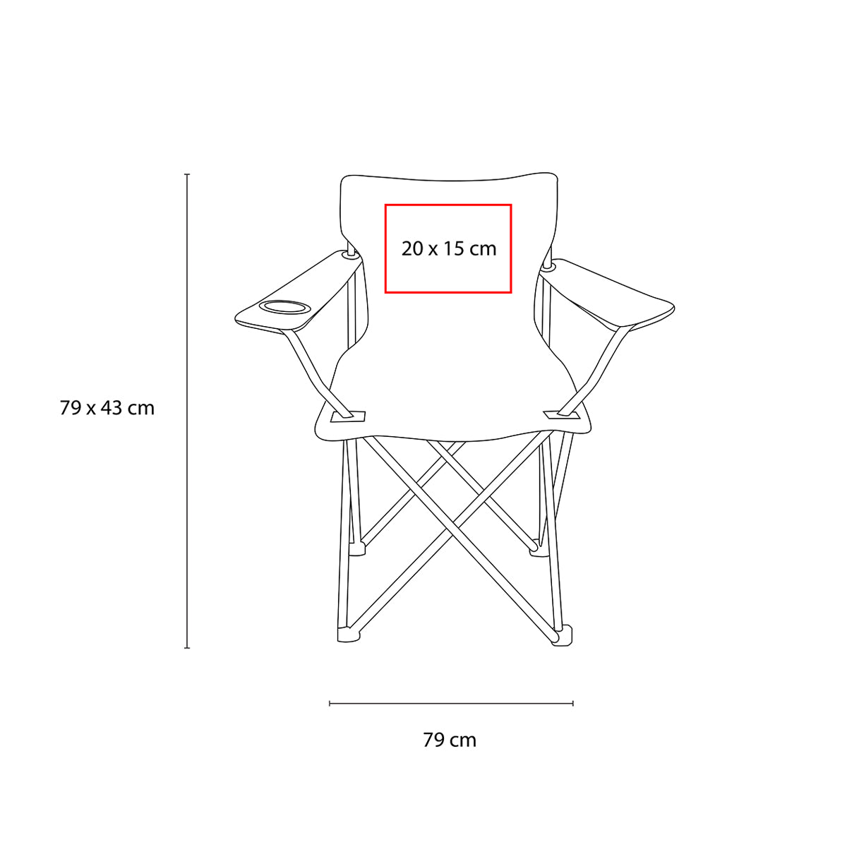 Silla plegable de fácil armado con reposabrazos, porta vasos de malla y funda con jareta y correa.