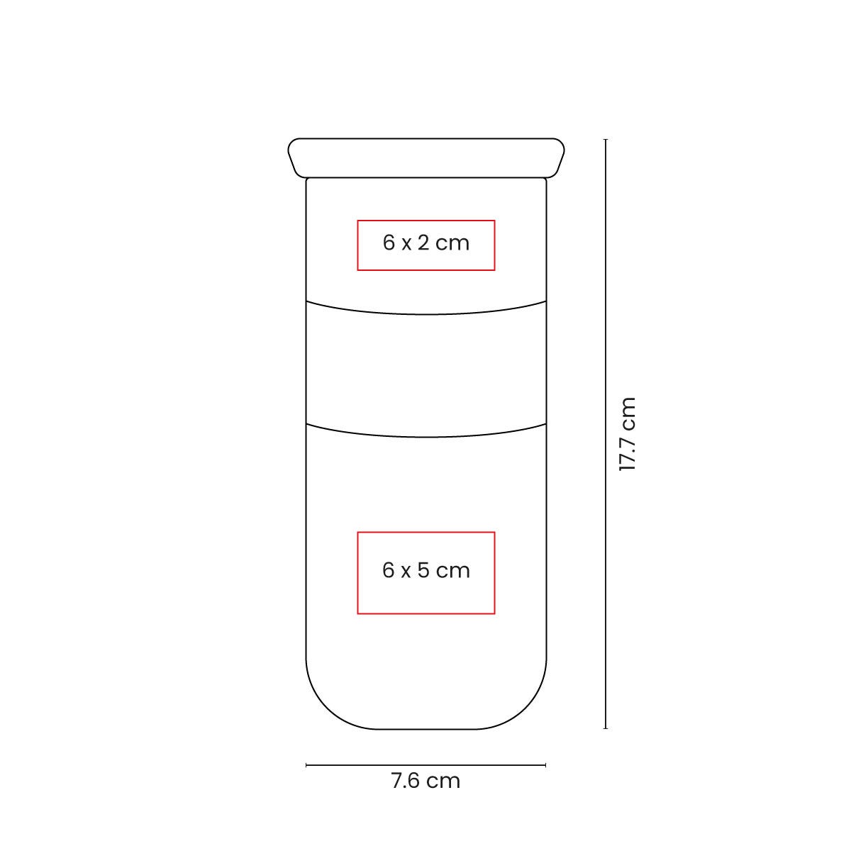Impresión: Láser / Serigrafía, 6 x 2 Arriba / 6 x 5 cm Abajo