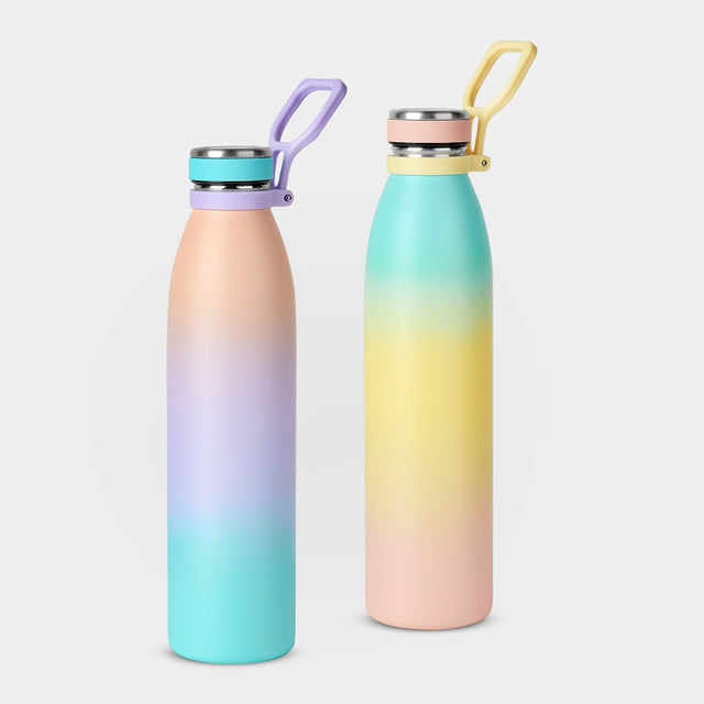 Doble pared. Cerrado al vacío. Pared interna y externa acero inoxidable. Terminado rugoso. Tapa de rosca con banda de silicón. Cuenta con asa de plástico plegable. Mantiene temperatura caliente 8 hrs y temperatura fría 12 hrs aproximadamente. Incluye caja individual.
