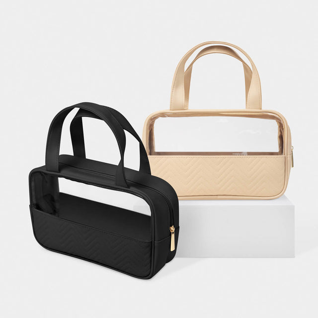 Neceser de curpiel con vista frontal en mica de PVC. Permite ver al interior y sus asas superiores ofrecen mayor comodidad en su traslado. Ideal para organizar productos de belleza, cuidado personal o viaje.