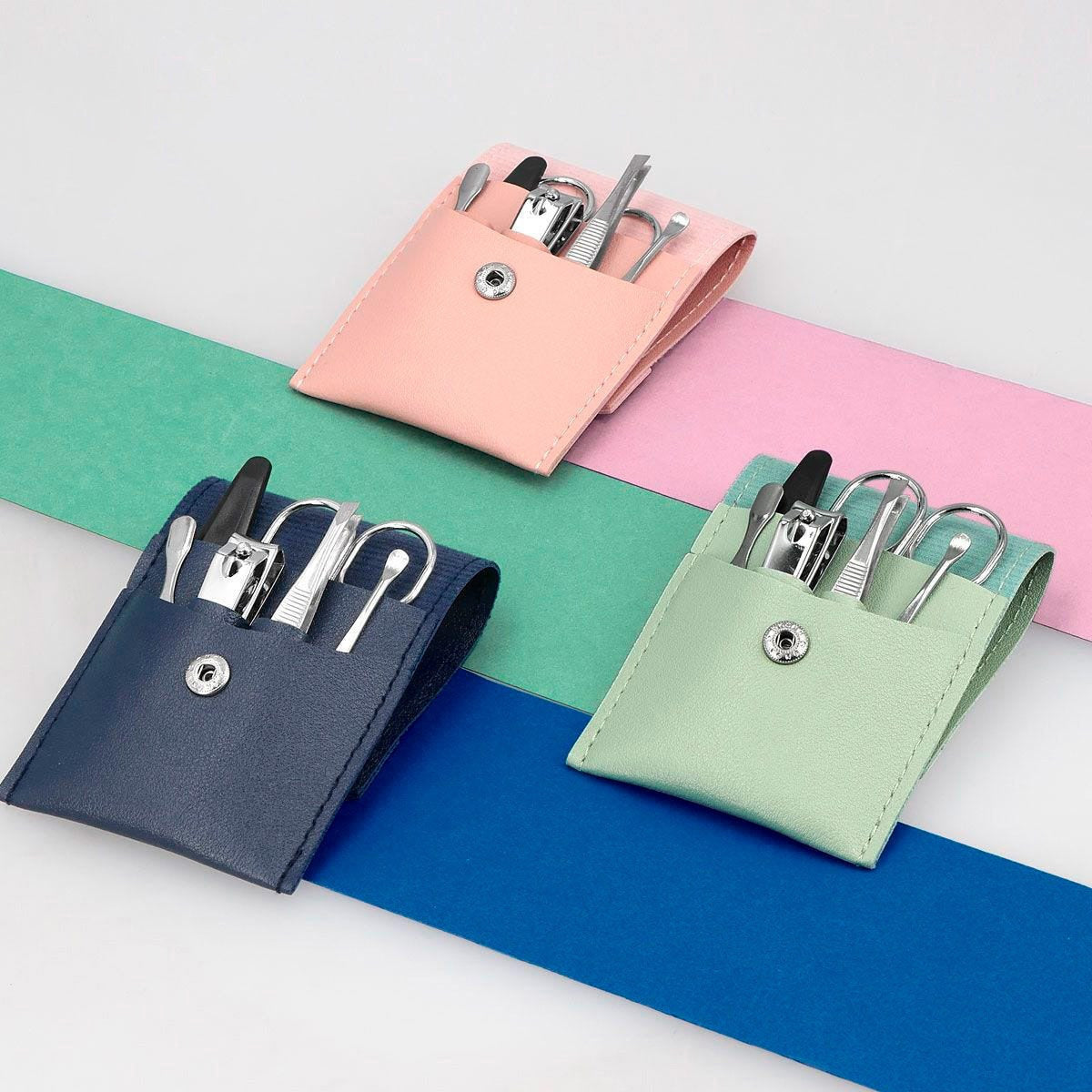 Set de manicure. Cuenta con sobre de curpiel con botón metálico. Incluye 6 piezas para un manicure básico: cortaúñas, tijeras curva para uñas, lima de uñas, empujador de cutícula, limpia uñas y pinza para cejas.