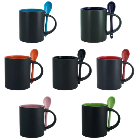 Taza de cerámica 11oz Mágica Color Negro Interior y cuchara de colores (Caja de 6)