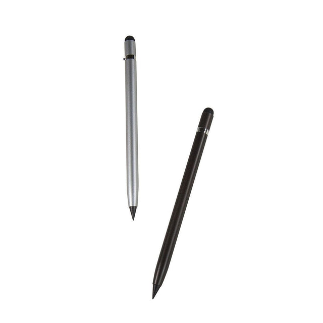 Lápiz infinito con recubrimiento metalizado y tapón de plástico. Incluye touchscreen y parte superior desprendible con borrador en su interior.