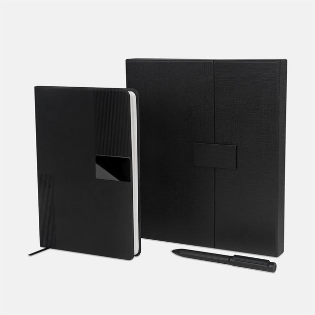 Medidas: 14.5 x 21 cm Libreta / 1.2 x 13.6 cm Bolígrafo / 22 x 24.5 x 2.8 Caja