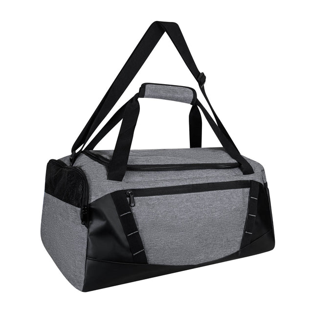 Maleta deportiva equipada con bolsa principal y una adicional en la parte frontal, ambas con cierre. Además, cuenta con un compartimento lateral para calzado y un bolsillo lateral de malla. Incluye correa ajustable para hombro y asas de agarre superior. Las costuras frontales permiten colgar objetos en ellas.