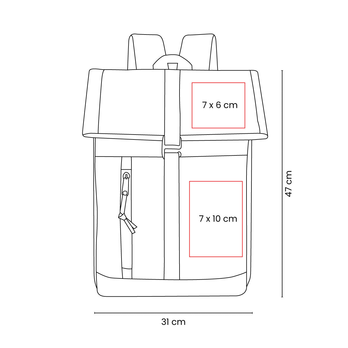 Impresión: Serigrafía/ Bordado, 7 X 6 cm Solapa / 7 x 10 cm Lateral