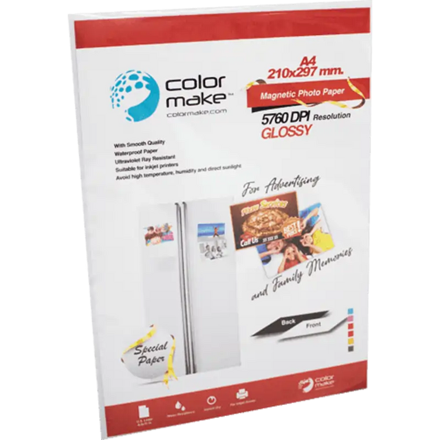Papel fotográfico magnético tamaño A4 de alta calidad para imprimir tus fotos favoritas, diseñar publicidad magnética o proyectos decorativos. No más marcos o cinta adhesiva ya que es más que perfecto para adherir a electrodomésticos y superficies metálicas. Disponible en Mate y Brillante. Use con la mayoría de impresoras de inyección de tinta. Evite las altas temperaturas, la humedad y la luz solar. Absorción y color excelentes.