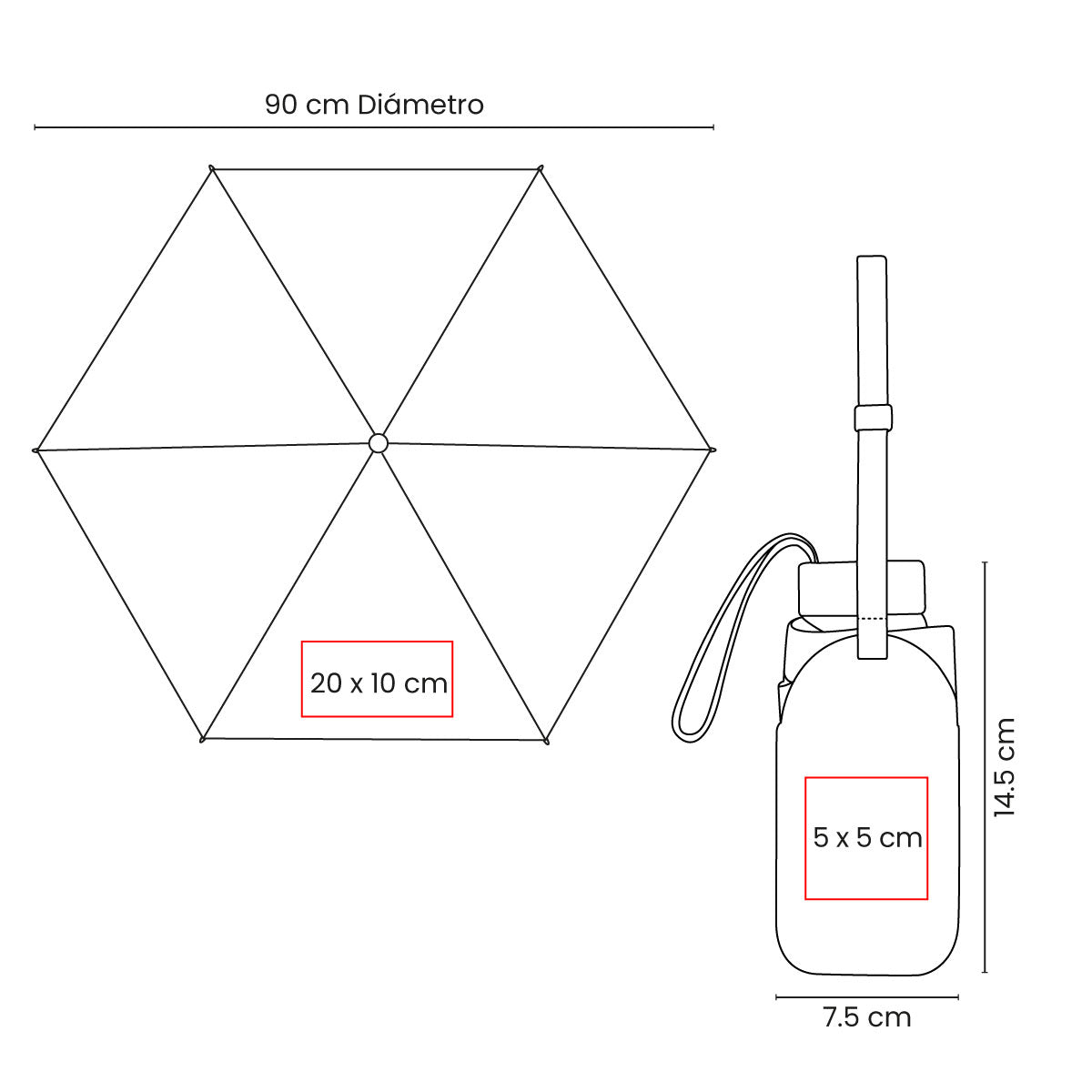 Impresión: Serigrafía, 20 x 10 cm Paraguas / 5 x 5 cm Estuche