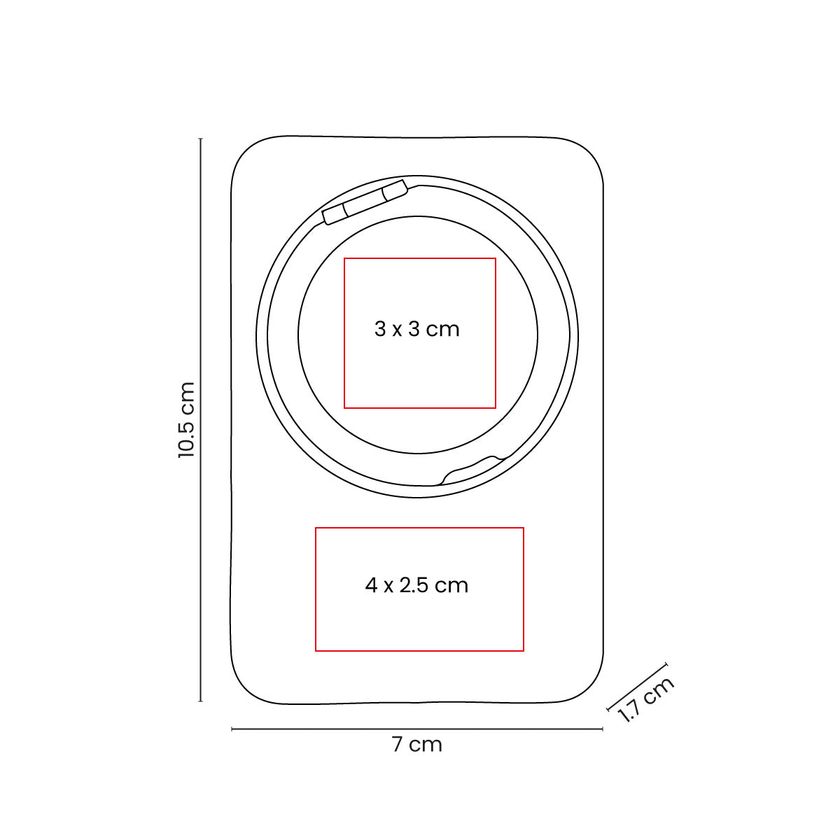 Impresión: Serigrafía / Tampografía, 3 x 3 cm / 4 x 2.5 cm