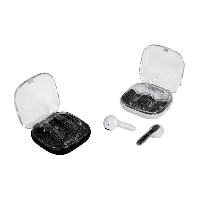 Audífonos bluetooth con base recargable. Su diseño permite una visión a su circuito interno gracias a su estructura transparente. Reproduce tu música favorita por 6 horas aproximadamente con un alcance de conexión de 10 metros. Incluye estuche con conexión tipo C, cable de carga y caja individual.